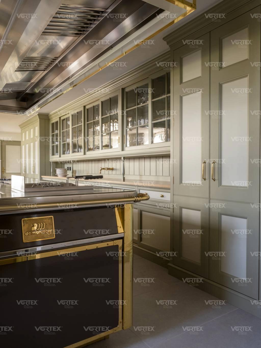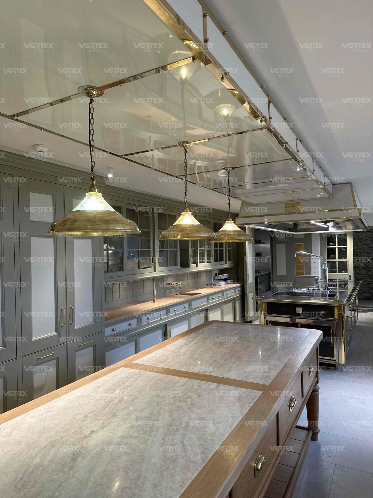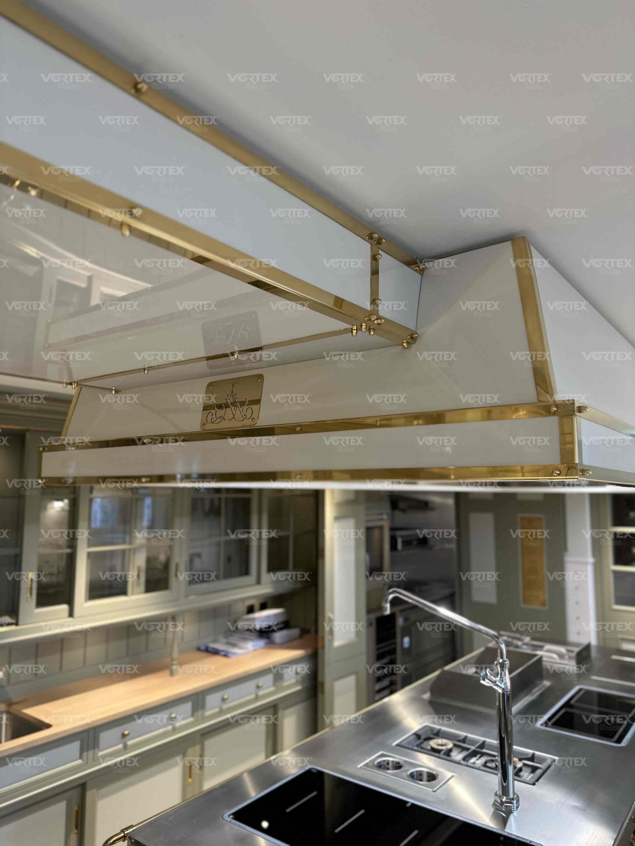 La cappa fornita è una cappa speciale realizzata interamente su misura, dallo scheletro fino alla copertura costituita da una pannellatura verniciata con tonalità RAL scelta dal cliente stesso; le pannellature verniciate che coprono il corpo della cappa e la relativa canalizzazione sono state poi completate con una ricercata profilatura in ottone, dettaglio che regala alla cappa uno spiccato tocco di eleganza senza tempo rendendo questa cucina unica nel suo genere.